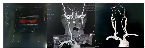 ▲超声示:右侧颈内动脉重度狭窄70-90%,左侧颈内动脉轻度狭窄小于50%,颈、头CTA证实:右侧颈内动脉起始处官腔重度狭窄,左侧颈内动脉起始处,双侧颈总动脉官腔轻度狭窄
