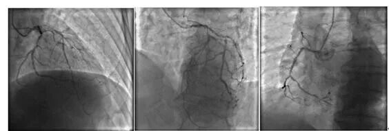 ▲冠脉造影示:回旋支重度狭窄;前降支近端重度狭窄,全程弥漫性狭窄;右冠重度狭窄